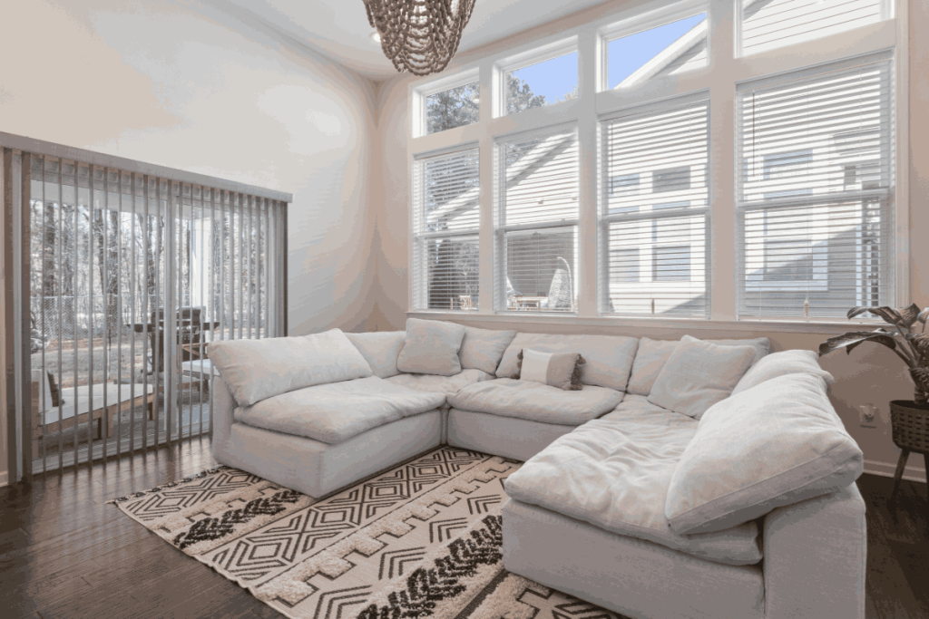 Rumah ini punya ruang terbuka dengan jendela besar yang menghubungkan interior dan taman, sehingga tercipta koneksi langsung ke alam. Palet warna hangat sekaligus netral juga turut mendominasi ruangan, sementara aksen kayu dan putih menciptakan suasana harmonis menenangkan.