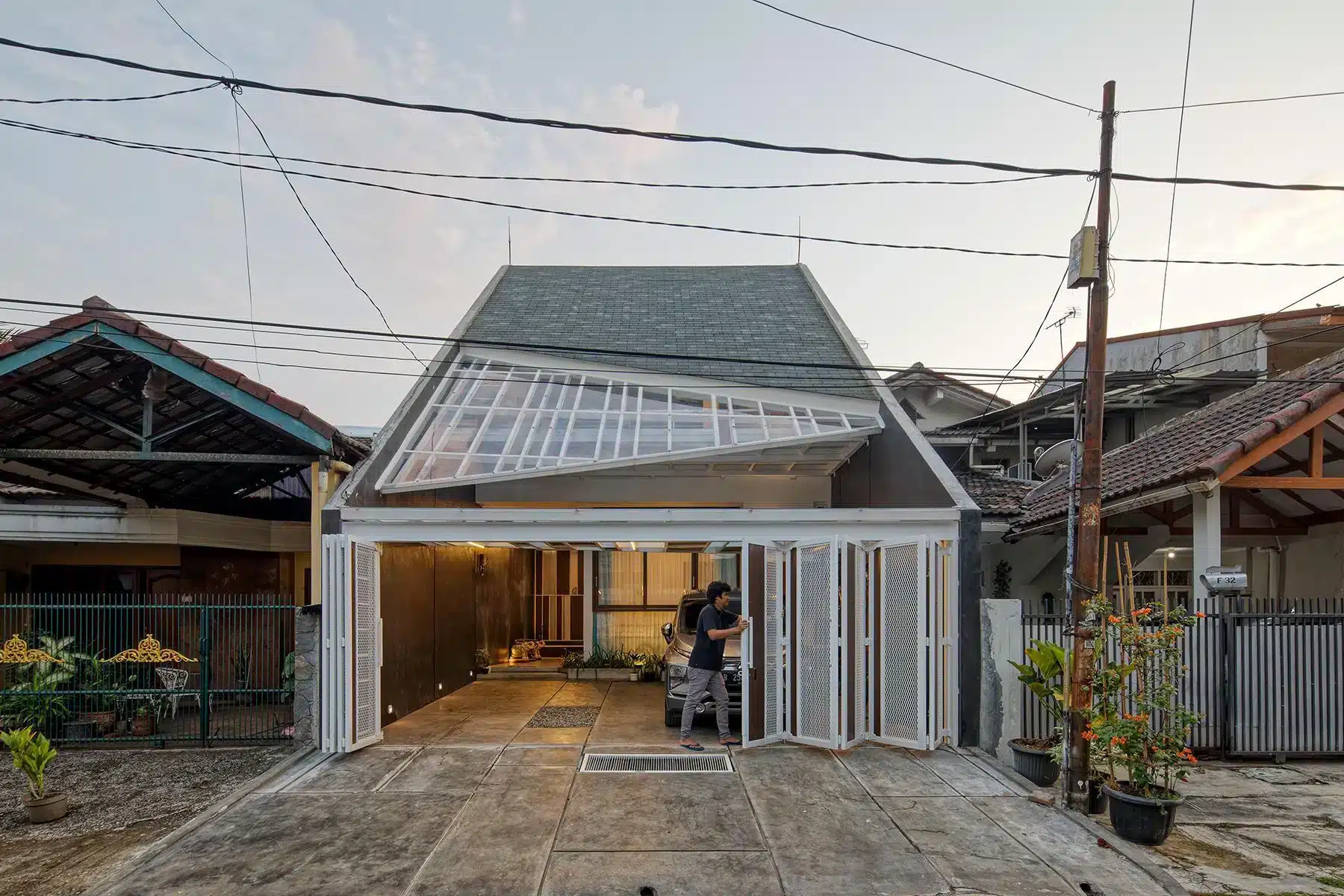 Atap limasan modern dengan finial (unsur dekoratif runcing di puncak atap) menjadi elemen identitas rumah ini. Sementara itu, garis-garis tegas dan bukaan kaca besar memberikan kesan kontemporer yang tidak berlebihan.