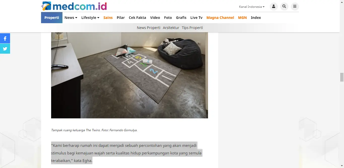 Jakarta: Banyak orang berpikir lahan rumah yang terbatas di tengah perkampungan padat tidak dapat didesain secara unik. Pendapat itu salah, jika Anda melihat konsep desain minimalis karya arsitektur Delution ini. Desain hunian yang dibangun di lahan terbatas ini dijuluki The Twins. Hunian tersebut dibangun dengan konsep rumah tumbuh, sehingga memungkinkan penghuninya membangun kembali dalam jangka panjang. The Twins pernah memenangkan Architizer Awards untuk kategori Small Architecture+ Small Living by People Choice pada September 2020. Architizer Awards merupakan sebuah ajang penghargaan arsitektur berskala dunia yang berbasis di New York, Amerika Serikat. Terdapat 5.000 karya arsitektur yang masuk dari 100 lebih negara di dunia. Melalui proses ini, penikmat arsitektur di dunia dapat memilih karya favoritnya untuk menjadi rumah kecil terbaik pilihan publik dunia. CEO Delution, Muhammad Egha mengatakan The Twins merupakan contoh nyata dari penerapan konsep rumah sehat, efisien, dan realistis di salah satu kota terpadat di dunia, yaitu Jakarta. Uniknya, rumah kecil yang dibangun di atas lahan dengan luas 70 meter persegi ini, dirancang dengan skema rumah tumbuh yang selesai dalam tiga tahapan. Tahapan pembangunan dilakukan dengan menyesuaikan ketersediaan dana dari sang pemilik rumah. Total dana yang dibutuhkan dalam pembangunan ini sebesar Rp400 juta. Rumah ini juga didesain dengan metode konstruksi konvensional yang dapat dibangun secara mandiri. Pemilik rumah dapat mengembangkan desain rumah sesuai selera dengan material lokal yang mudah ditemukan.”Kami berharap rumah ini dapat menjadi sebuah percontohan yang akan menjadi stimulus bagi kemajuan wajah serta kualitas hidup perkampungan kota yang semula terabaikan,” kata Egha.