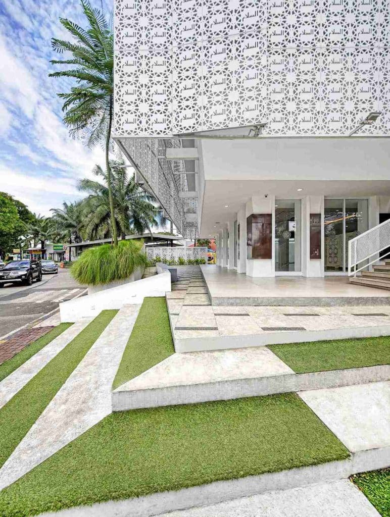 Area sekeliling bangunan dipenuhi tanaman hijau, menghadirkan nuansa alami yang sejuk.