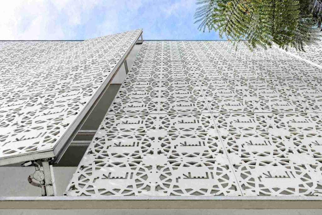 Motif dzikir kemudian berlanjut pada secondary skin dari material Glass Fibre Reinforced Concrete (GFRC), menciptakan permainan cahaya dan bayangan yang berubah sesuai waktu salat.