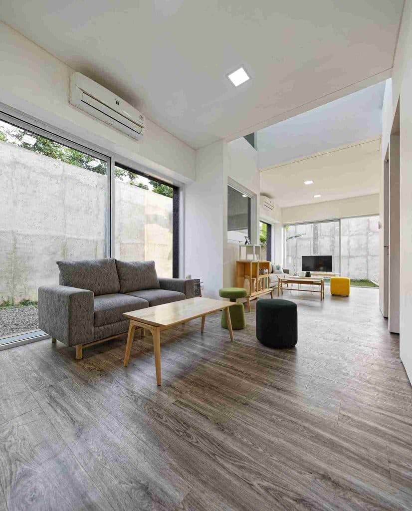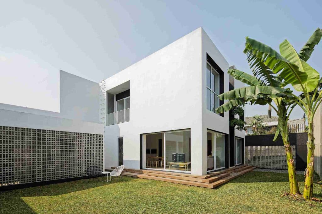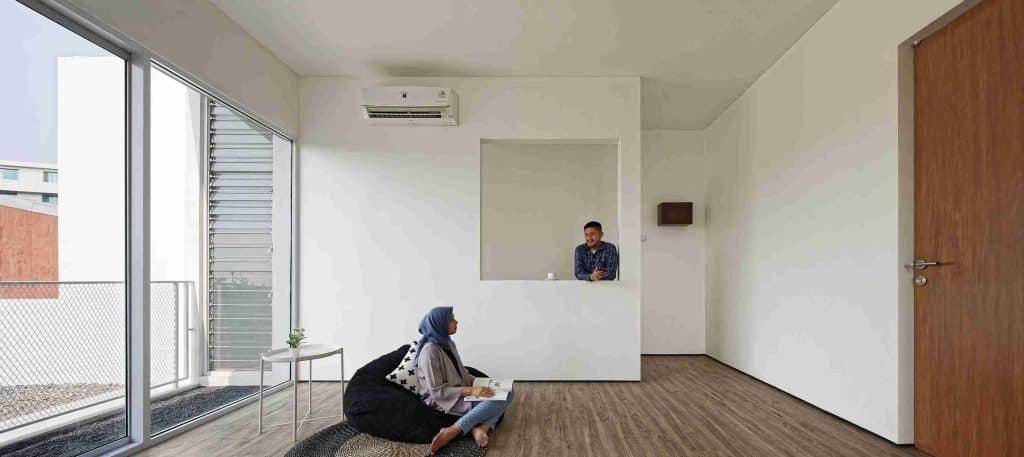 Setiap ruang persegi diatur saling berhadapan sehingga rumah ini membutuhkan bukaan besar agar sirkulasi udara tetap optimal. Menariknya, setiap bukaan juga mengikuti bentuk persegi yang menyesuaikan layout ruangan, menjadikan keseluruhan desain tetap harmonis dan seragam.