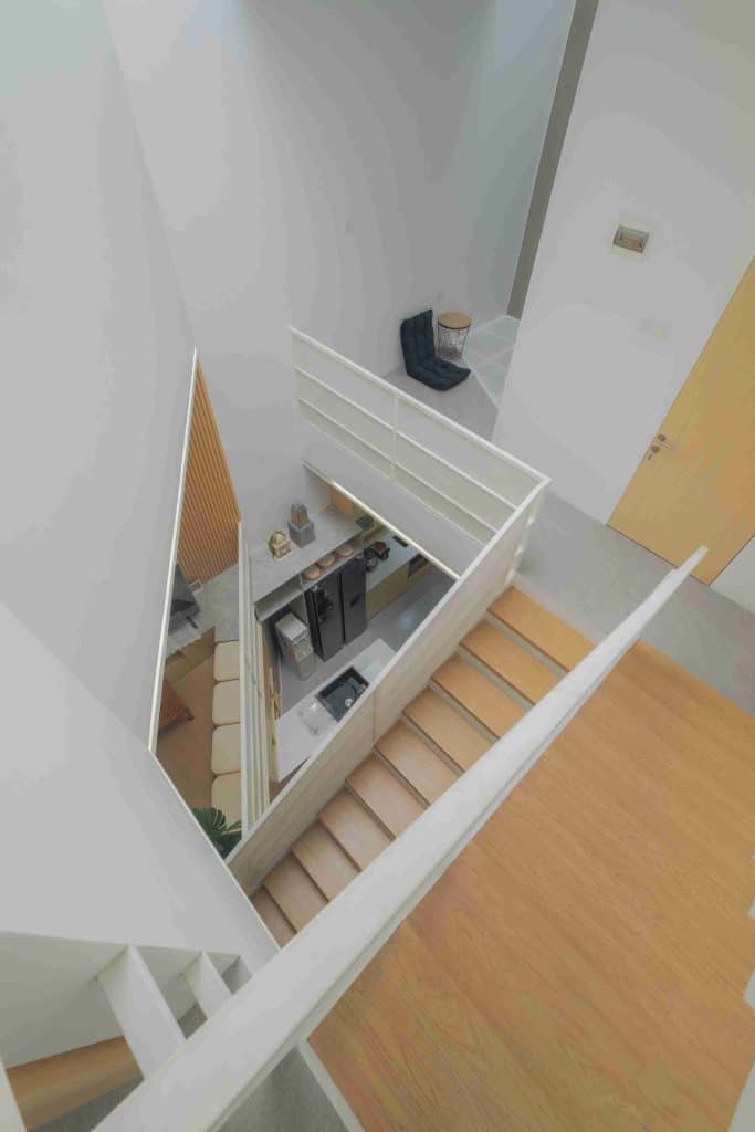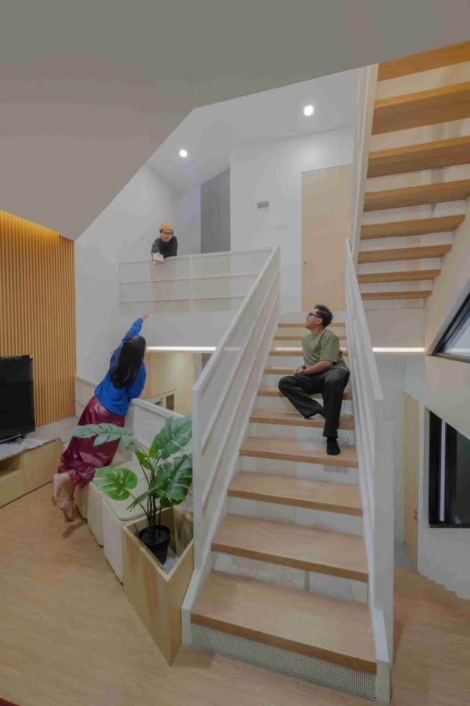 Void besar di tengah rumah berfungsi sebagai skylight utama yang membawa cahaya alami ke seluruh area. Di sisi rumah, taman samping selebar 1 meter menjadi jalur udara alami yang menjaga rumah tetap sejuk meski berada di kawasan padat.