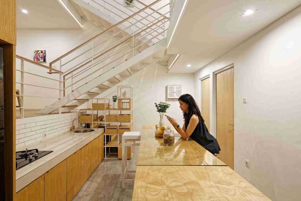 Di lantai mezzanine pertama, terdapat dapur dan ruang makan yang dirancang efisien dengan meja lipat — bisa dibuka saat digunakan dan dilipat kembali untuk menghemat ruang.