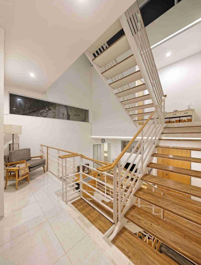 Ruang tengah rumah dilengkapi void besar yang menjadi sumber utama cahaya alami dan sirkulasi udara. Selain fungsi teknis, void juga berperan penting dalam menciptakan interaksi vertikal antar penghuni rumah — memungkinkan mereka berkomunikasi dari lantai berbeda dengan mudah.