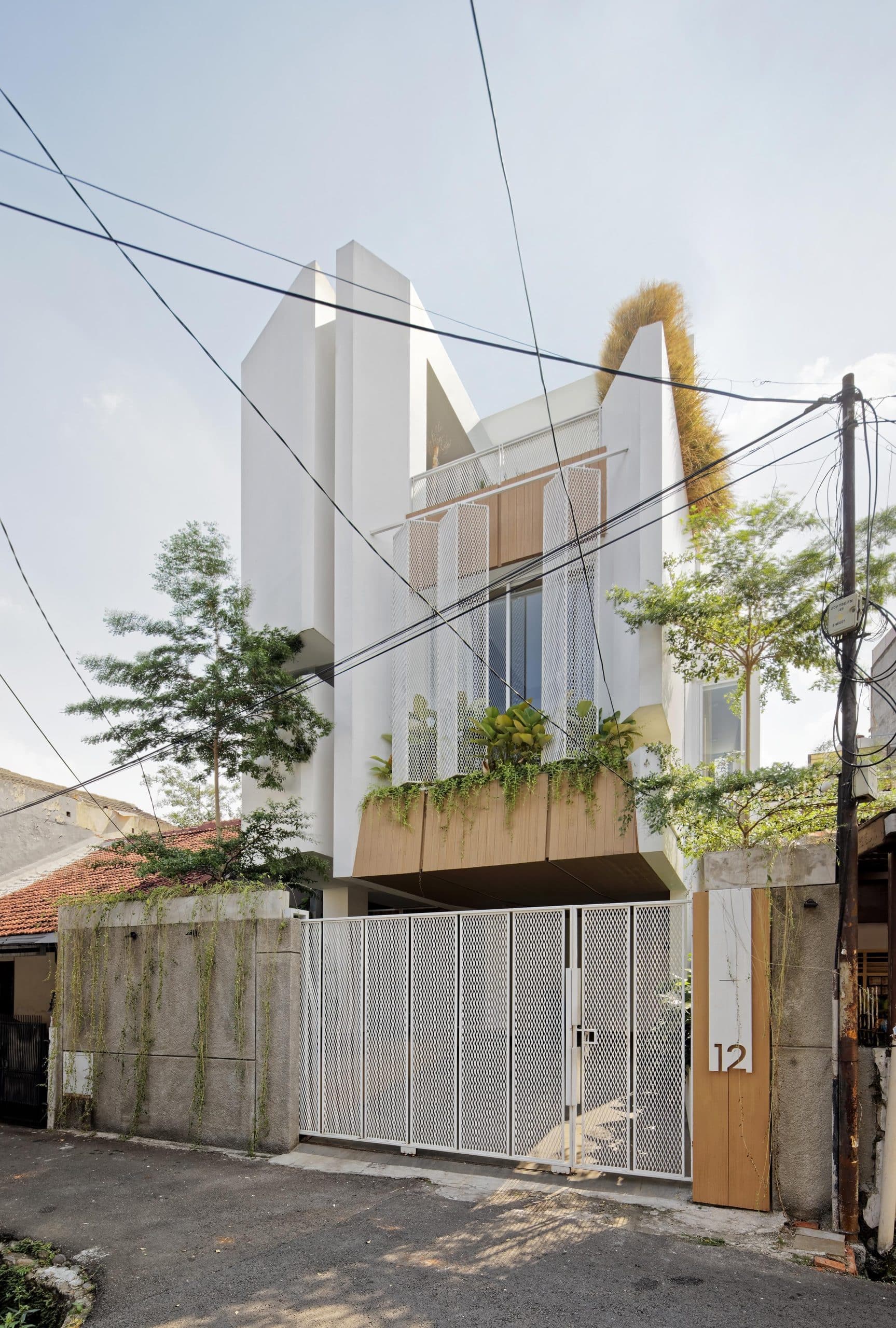 | The upper house design concept then raises the potential of the spaces that are then developed by the architect into green spaces, such as the remaining space on first floor entrance area which is then used as a small garden complete with a semi-outdoor gathering space to receive guests. The green spot on the first floor is also placed in the circulation area of the main staircase which is the only access to the main rooms on the second and third floors. The circulation Area of the staircase was designed semi outdoor with a greenwall vines on one side and a tree pot in the transition area. The greenwall allows residents to enjoy a green atmosphere from both the second and third floors of the building. |