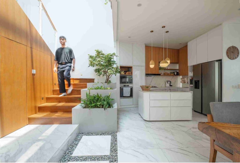 • Area dapur yang memiliki visual hijau dari planter di bawah tangga