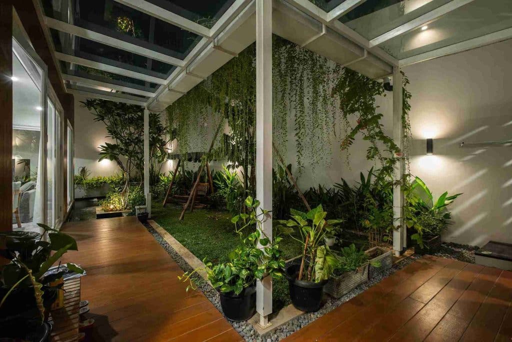 Konsep utama rumah ini mengusung pendekatan biophilic design—sebuah filosofi desain yang bertujuan untuk menciptakan koneksi mendalam antara manusia dan alam. Kata biophilia sendiri berasal dari bahasa Yunani, yakni “bio” yang berarti hidup dan “philia” yang berarti cinta. Secara harfiah, artinya adalah love of life or living things—cinta terhadap kehidupan dan makhluk hidup.