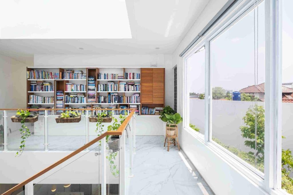 Kecintaan klien terhadap buku diwujudkan melalui kehadiran wall library di lantai dua dan sudut baca di ruang kerja.