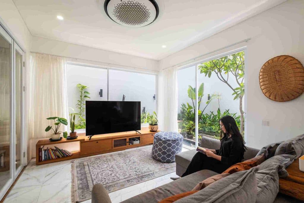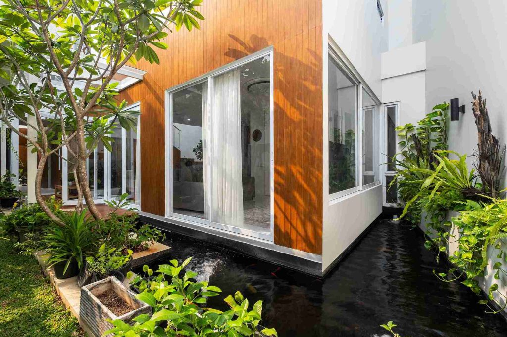 • Ruang living yang dapat dibuka penuh ke arah kolam ikan dan taman